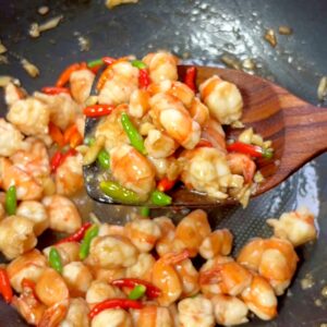 2.ใส่กุ้งลงไปผัดจนเริ่มสุก