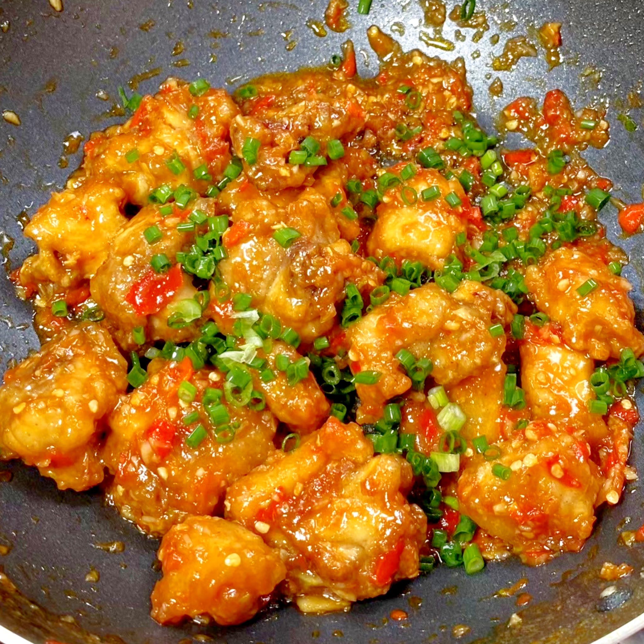 -ใส่ไก่ทอดลงไปในกระทะ คลุกให้ซอส