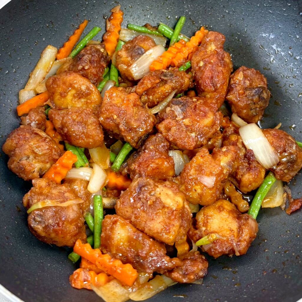 3.ใส่ไก่ทอดลงไป ตามด้วยหอมใหญ่