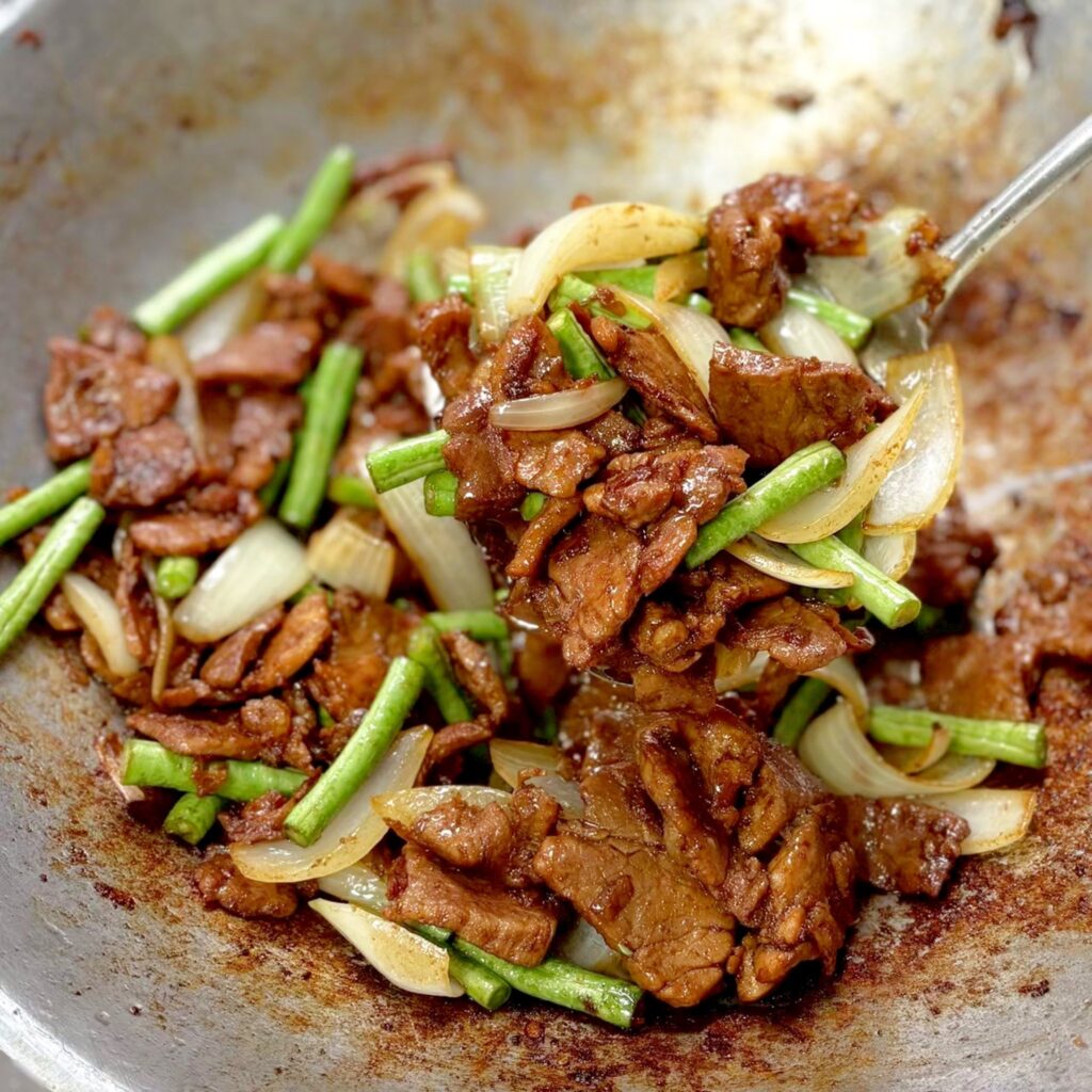 เนื้อผัดหอมใหญ่ถั่วฝักยาว