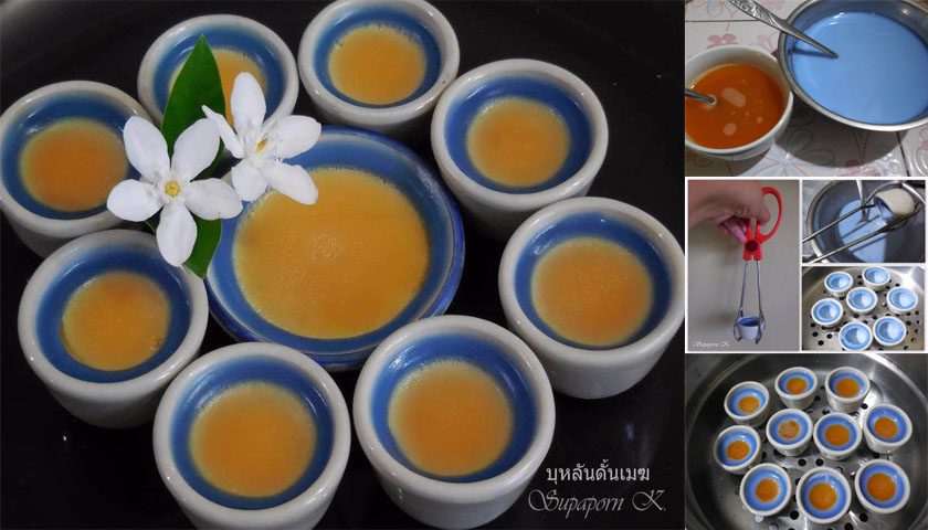– นำถ้วยตะไลใส่ซึ้งนึ่งประมาณ 10 นาที เเล้วนำส่วนของเมฆ หยอดลงไป นึ่งด้วยไฟเเรงประมาณ 1- 2 นาที