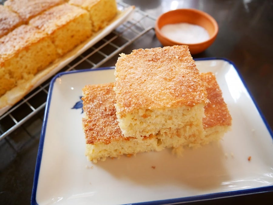 5. เทใส่ถาดที่กรุกระดาษไข ใช้ถาด 8x8x2” เกลี่ยให้หน้าขนมเรียบเเล้วโรยน้ำตาลทรายให้ทั่วหน้าขนม