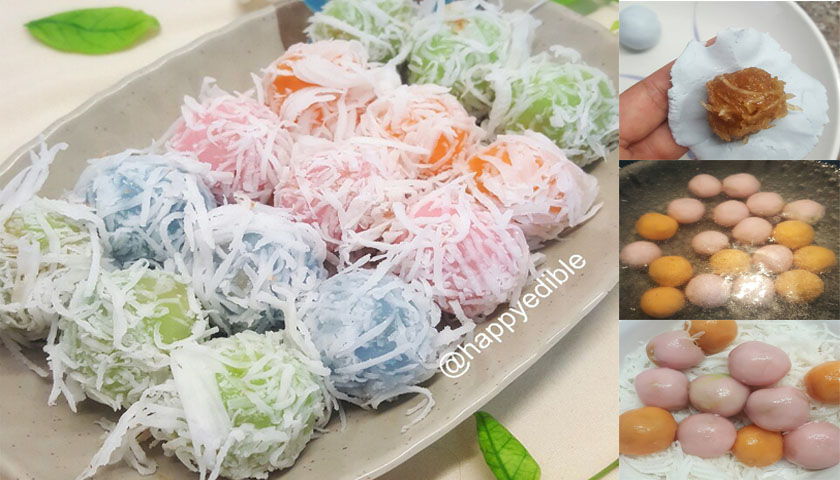 เเป้งตัวขนมเอามาปั้นเป็นก้อนกลมๆ เเผ่ออกเเล้วใส่ไว้มะพร้าวที่ปั้นเป็นก้อนกลมๆไว้ ห่อให้มิดทำจนหมด