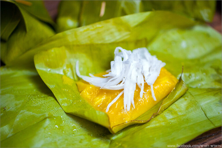 เมื่อเสร็จเเล้วนำไปห่อใบตองหรือใส่ถ้วย เเละนำไปนึ่งประมาณ 15 นาที