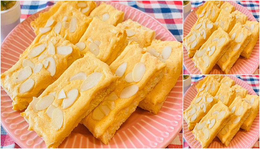 นำมามาขนมปังให้หนาประมาณ 1/2 เซนติเมตร เเล้วจึงโรยหน้าด้วยอัลมอนด์สไลด์