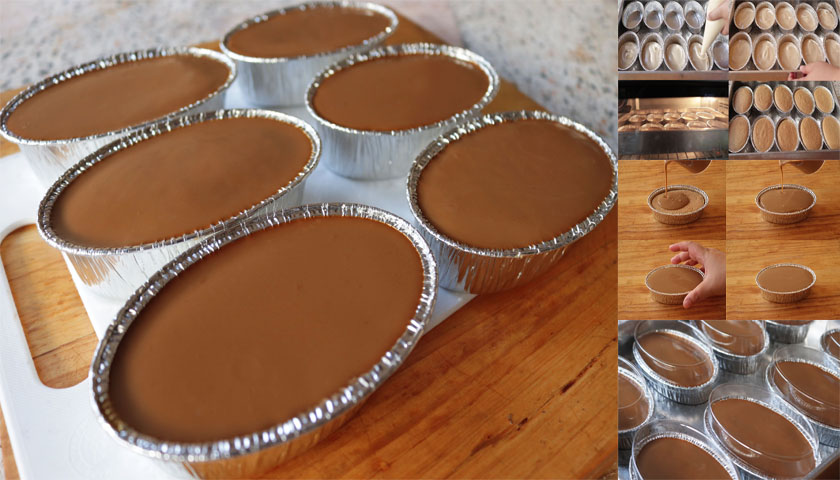 5.เทหน้านิ่มลงไปให้เต็มพิมพ์ จากนั้นเคาะไล่ฟองอากาศ พักให้หน้านิ่มเซตตัวประมาณ 15-20นาที
