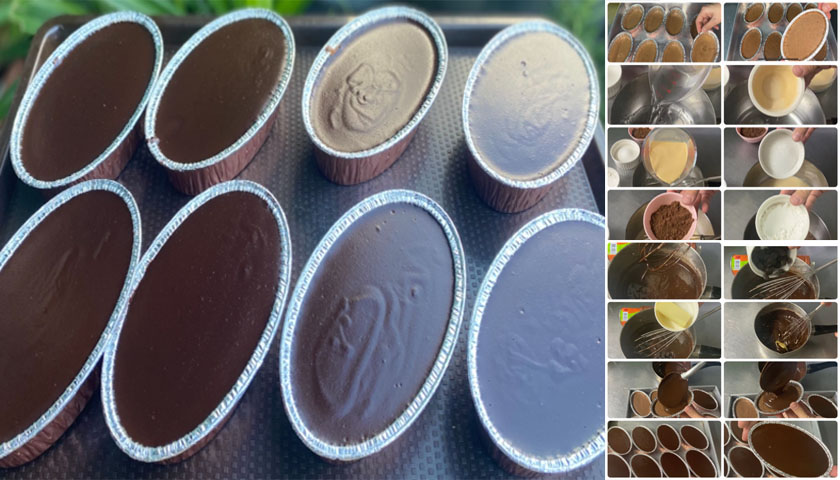 – นำส่วนผสมทุกอย่างยกเว้นเนยสดกับดาร์กช็อกโกเเลต ผสมกับ เเละตั้งไฟจนส่วนผสมข้น