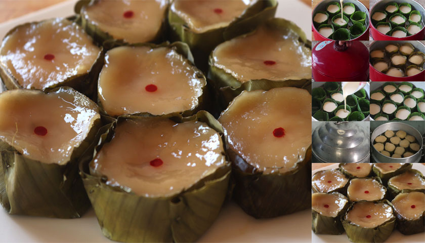 7.เทเเป้งลงไปในกระทง จากนั้นนึ่งด้วยไฟกลางประมาณ 30 นาที พอนึ่งเสร็จก็พักให้เย็ยสนิท