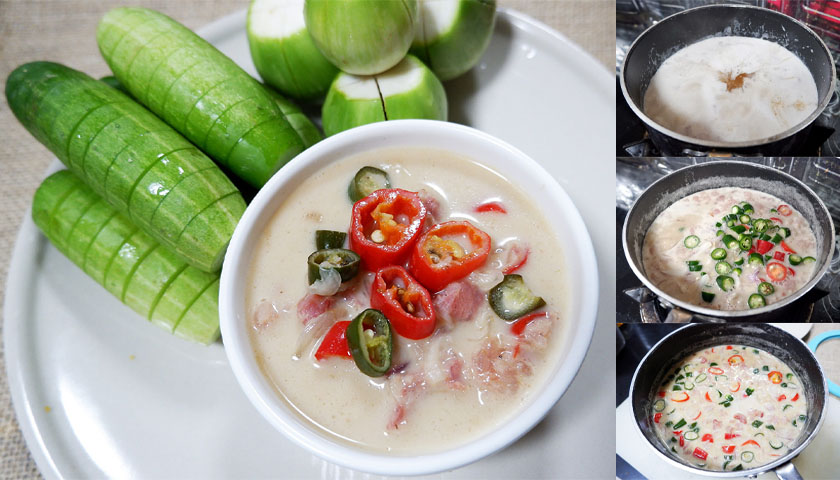 1. ตั้งกะทิพอเดือด ใส่เเหนมลงไป ปรุงรสด้วยน้ำตาล น้ำปลา เเละน้ำมะขาม