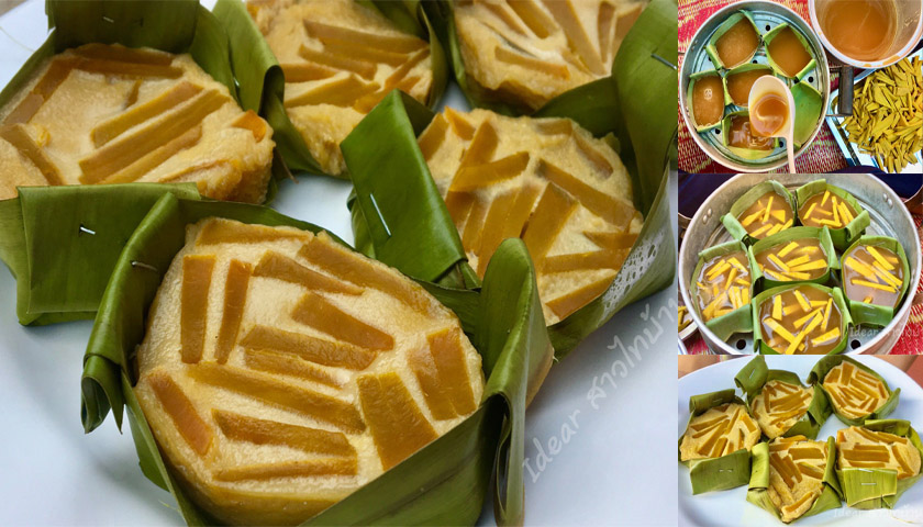 โรยหน้าด้วยฟักทองเเล้วยกไปนึ่ง จนกว่าขนมจะสุก