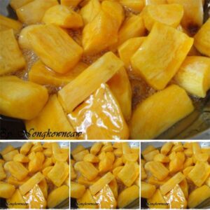 เมื่อน้ำเชื่อม กับมันเทศที่เราแช่ในน้ำปูนใสพร้อมทั้งสองอย่างแล้ว นำมันเทศขึ้นจากน้ำปูนใส ล้างมันเทศหลาย ๆ น้ำก่อนนะคะ