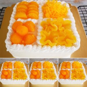 9 . เมื่อเค้กเย็นดีแล้วให้ปาดวิปปิ้งครีมให้ทั่วตัวเค้ก และบีบวิปปิ้งครีมเป็นเส้นแบ่งเป็นเป็น 4 ส่วน เพื่อใส่ขนมไทยและส้ม
