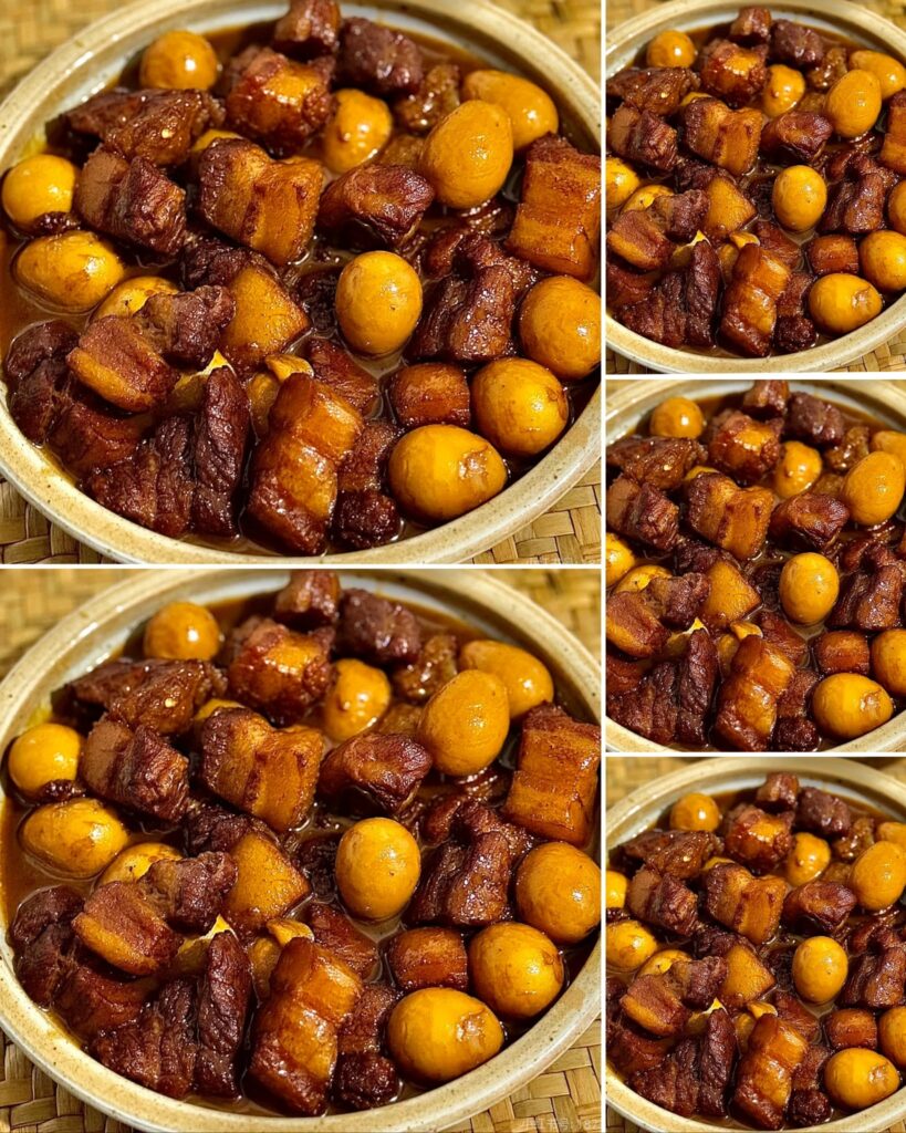-นำน้ำตาลปี๊บหรือน้ำตาลมะพร้าวใส่ในกะทะ2ช้อนโต๊ะใส่น้ำปลา3ช้อนโต๊ะ คนน้ำตาลปี๊บกับน้ำปลาไปเรื่อยๆจนเริ่มข้นใส่สามเกลอ ลงไปผัดรวมกัน นำหมู3ชั้นเเละไข่นกกะทาใส่ลงไป คนให้เข้ากัน