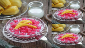 5. จัดเสิร์ฟ – ตักน้ำแข็งใส่ถ้วย ตามด้วยทับทิมกรอบ น้ำเชื่อม แล้วราดน้ำกะทิหอม ๆ ด้านบน