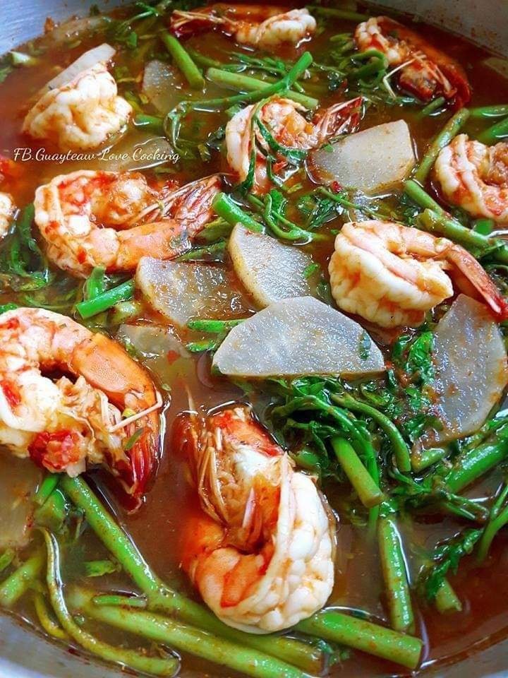 เเจกสูตรวิธีทำ เเกงส้มผักกระเฉดกุ้งสดจร้า