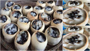 5. เอาใบเตยรองก้น แล้วตักส่วนผสมใส่ในลูกมะพร้าว ไม่ต้องใส่ให้เต็มมากนะคะ ใส่เกือบๆเต็มลูก