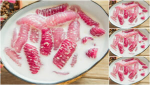 4.ทำสีแดงเข้มสุด นำบีทรูทไปนึ่งจนน้ำสีแดงๆ ออกมา หากอยากได้สีเยอะก็เอาไปปั่นค่ะ กรองด้วยผ้าขาวบาง