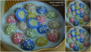 – ตั้งหม้อต้มน้ำ พอเดือดใส่ใบเตยลงไป รอให้เดือดสักพัก ใส่แป้งที่ปั้นไว้ลงไปต้มให้สุก (แป้งจะลอยขึ้น)