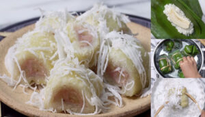 4. เตรียมมะพร้าวขูด ผสมน้ำตาลทรายและเกลือ จากนั้นก็แกะข้าวต้มมัดออก แล้วนำไปคลุกกับมะพร้าว