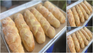 9. เมื่อสุกพักขนมปังให้เย็นก่อนทาหน้าขนมปังด้วยเนยสดและน้ำตาล