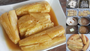 ล้างมันให้สะอาดเอาเศษดินออกให้หมด จากนั้นปอกเปลือกล้างให้สะอาดอีกครั้ง พักไว้ให้สะเด็ดน้ำ