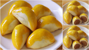 4.นำไปอบไฟ 170-180ํ ํ C ไฟบน-ล่าง เป็นเวลา 13-15 นาที พออบเสร็จพักไว้สักครู่จากนั้นทาไข่แดง