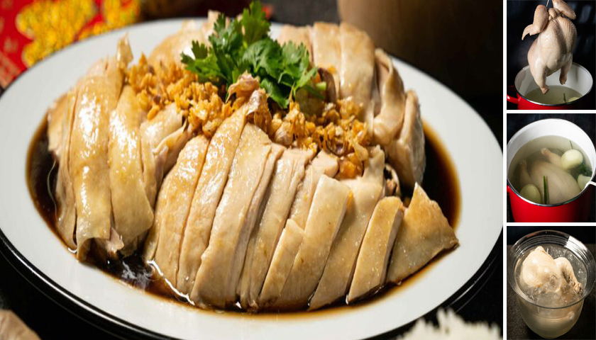 1.ใส่น้ำ ต้นหอม ขิงเเก่ หอมใหญ่ เกลือ น้ำมันงาเเละน้ำส้มสายชูลงในหม้อ ใส่ไก่ตอน ยกขึ้นตั้งบนไฟกลาง เมื่อต้มไก่ไปซักพักจนไก่ลอยขึ้นมาให้กดไก่ให้จมอยู่เสมอ เเละพอน้ำเริ่มร้อน มีตะกอนหรือฟอง ใช้ทัพพีช้อนฟองออกจนหมด ลดไฟเป็นไฟอ่อน จากนั้นจึงเริ่มจับเวลาต้มไก่โดยใช้เวลาประมาณ 60 นาทีหรือ 1 ชั่วโมง (ให้เริ่มจับเวลาตอนช้อนฟองออกเรียบร้อยเเล้ว)