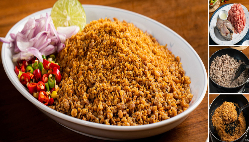 ตั้งกระทะบนไฟอ่อน พอกระทะร้อนใส่น้ำมันพืช กลอกให้ทั่วกระทะ ใส่ปลาเค็มผสมหมูสับลงไป ผัดจนส่วนผสมสุกเเห้ง ระหว่างผัดให้ใช้ตะหลิวยีให้เนื้อหมูเป็นชิ้นร่วนๆ ผัดคั่วไปเรื่อยๆจนเเห้ง ปิดไฟ พักส่วนผสมให้หายร้อนเเล้วค่อยๆเเบ่งมีทีละ 1/3 โขลกให้เนื้อหมูเเตกเป็นปุยๆ ทำจนหมด เทหมูปลาเค็มที่โขลกเเล้วกลับลงกระทะ ใส่ผงสามเกลอเเละน้ำตาล ผัดคั่วต่อจนเเห้งดี ปิดไฟ