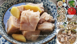 ล้างเพื่อให้ยางออกหมด แล้วเอาลงแช่ในน้ำปูนใส (แช่เพื่อตอนต้มเนื้อจะไม่เละมาก)