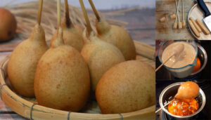 8. น้ำมันร้อนแล้วนำใส่กรอกที่เสียบไม้ไว้มาชุบแป้ง แล้วนำไปทอดให้สีเหลืองสวย แล้วพักไว้ให้อุ่น