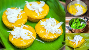 เมื่อเสร็จแล้วนำไปห่อใบตองหรือใส่ถ้วย และนำไปนึ่งประมาณ 15 นาที