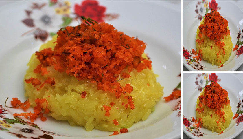 เเบ่งปันวิธีทำ “ข้าวเหนียวเหลืองหน้ากุ้ง” สูตรใส่กุ้งจริงเเบบโบราณ ขนมไทยสีสวย หอมหวานเค็มอร่อยลงตัว