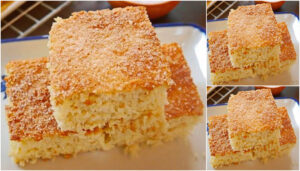 5. เทใส่ถาดที่กรุกระดาษไข ใช้ถาด 8x8x2” เกลี่ยให้หน้าขนมเรียบแล้วโรยน้ำตาลทรายให้ทั่วหน้าขนม