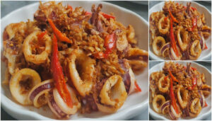 6.จัดปลาหมึกใส่จานโรยด้วยกระเทียมเจียวเพียงเท่านี้ก็พร้อมเสิร์ฟแล้ว