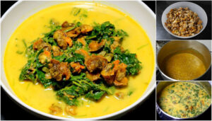 ใส่หัวกะทิที่เหลือ พอแกงเดือด ใส่ใบบัวบกที่หั่นเป็นชิ้นเล็ก