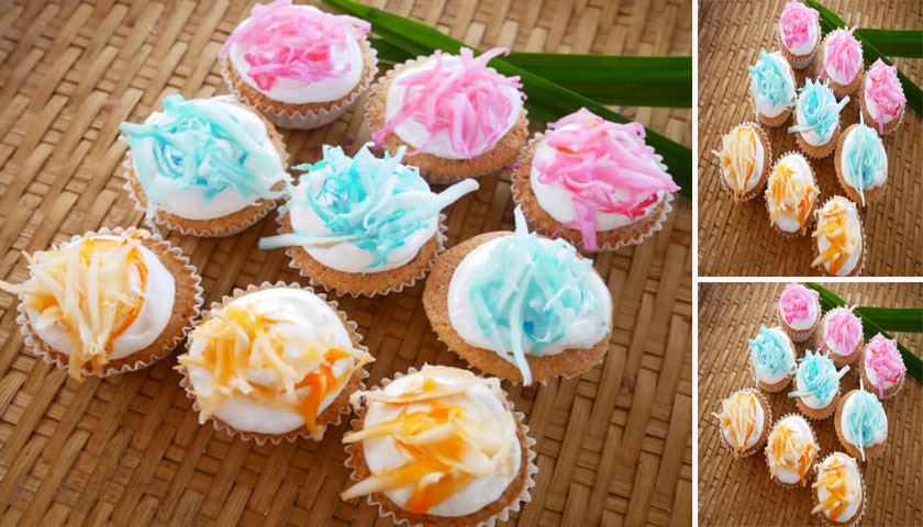 7. เมื่อขนมสุกให้พักให้ขนมเย็น เเล้วบีบครีมบนหน้าขนม (หากไม่ใช้ถุงบีบ สามารถใช้เป็นช้อนตักก็ได้ค่ะ) หลังจากนั้นให้ใช้ไม้เสียบลูกชิ้นจุ่มสี เเล้วนำมาวนเป็นวงกลมๆบนครีม เเละโรยด้วยมะพร้าวที่ผสมสีไว้