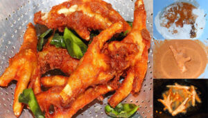 4.น้ำตีนไก่ลงไปชุบในแป้งทอดที่ผสมไว้ แล้วนำลงไปทอดจนเหลืองหอม