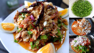 ตักใส่จานโรยหน้าด้วยหอมเจียว เม็ดมะม่วงหิมพานต์ และพริกแห้งทอด