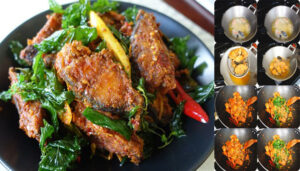 แล้วนำปลาดุกทอดกรอบที่พักไว้มาลงผัดให้เข้ากับน้ำพริก ให้ทั่วตัวปลา โรยด้วยใบกระเพรากรอบ เสร็จค่ะ