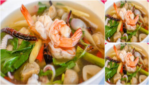2 ใส่กุ้ง ปลาหมึก และ หอยแมลงภู่ ลงไป ตามด้วยเห็ดฟาง ปล่อยทิ้งไว้จนทุกอย่างสุก