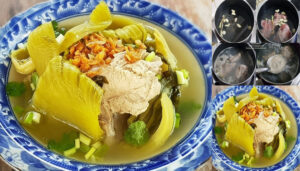 ล้างกระดูกหมูด้วยเกลือเพื่อดับกลิ่น ผักดองล้างน้ำแล้วลวกในน้ำเดือด ตักขึ้นพักไว้