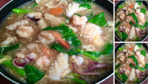 จึงเทเครื่องทะเลที่หมักไว้ลงตามปล่อยน้ำซุปให้เดือดจนหมึก,กุ้ง,หอยสุก น้ำ