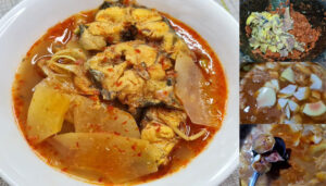ใช้น้ำเดือดที่ต้มปลานั้นเองมาทำแกงส้มต่อ โดยนำน้ำพริกที่โขลกรวมกับเนื้อปลาแล้วละลายลงในหม้อ