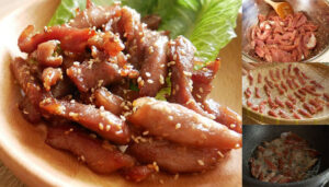 1. หั่นเนื้อหมูให้เป็นเส้นๆค่ะ ประมาณความหนาประมาณ 1.5 cm ค่ะ ถ้าบางกว่านี้เดี๋ยวแห้งแล้ว