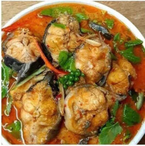 4.ใส่ปลาดุก ตามลงไป ปรุงรสด้วยน้ำปลา น้ำตาลทราย กะปิ ใบมะกรูด มะเขือ ถั่งฝักยาว พริกชี้ฟ้า พริกไทยสด มะเขือพวง คนให้เข้ากันดี