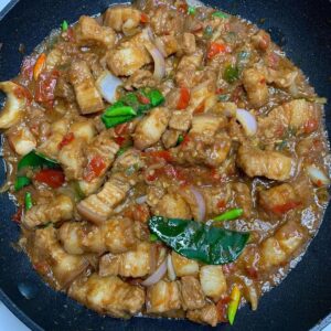 4. ปรุงรสด้วยน้ำตาลปิ๊บ กะปิเค็มอยู่แล้วอย่าพึ่งเติมน้ำปลา ให้ชิมรสก่อนได้รสถูกใจใส่ใบมะกรูด ผัดต่อสองสามทีปิดไฟตักใส่จาน