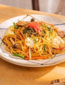 3.ตักยากิโซบะใส่จาน ตกแต่งด้วยสาหร่ายผงและขิงดอง เสิร์ฟ