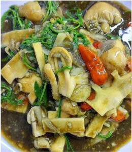 3.ใส่เห็ดฟางหั่น ชะอมเด็ด ใบแมงลัก และพริกขี้หนูลงไปในหม้อ คนเล็กน้อย รอให้สุก จากนั้นตักมาชิม หากยังไม่ถูกใจก็สามารถปรุงรสเพิ่มได้