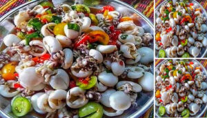 2.เอาหมึกใส่ในชามผสม ปรุงรสด้วย พริกแดงปั่น มะนาว ซอสพริก น้ำตาลทราย น้ำปลา และน้ำปลาร้า