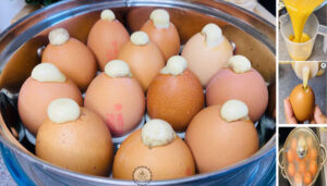 5. นำไปเทใส่เหยือกหรือกระบอกเพื่อกรอกไข่ที่ปรุงรสแล้วกลับคืนไปในเปลือกไข่ให้เกือบเต็ม แต่ไม่ต้องเติมปริ่มมาก จัดเรียงลงถาดอบซึ่งมีถ้วยตะไลรอง หรือจะใช้ฝาขวดน้ำอัดลมรองไม่ให้ไข่ล้มได้เช่นกัน